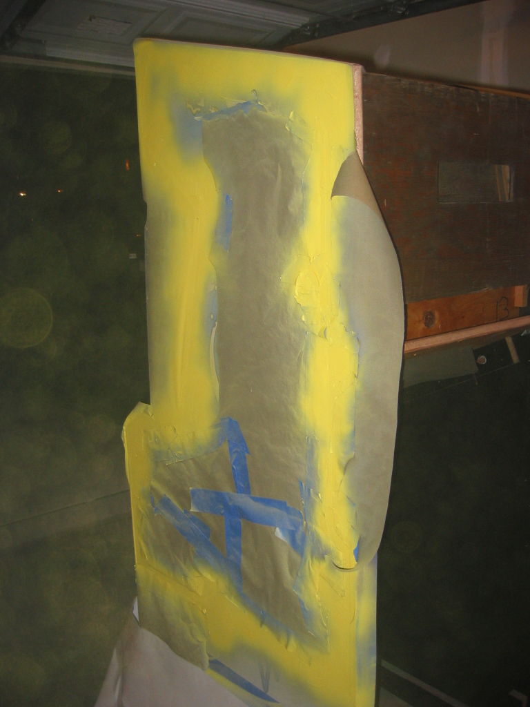 Here's ther cabinet after painting it yellow (before removing the frisket)